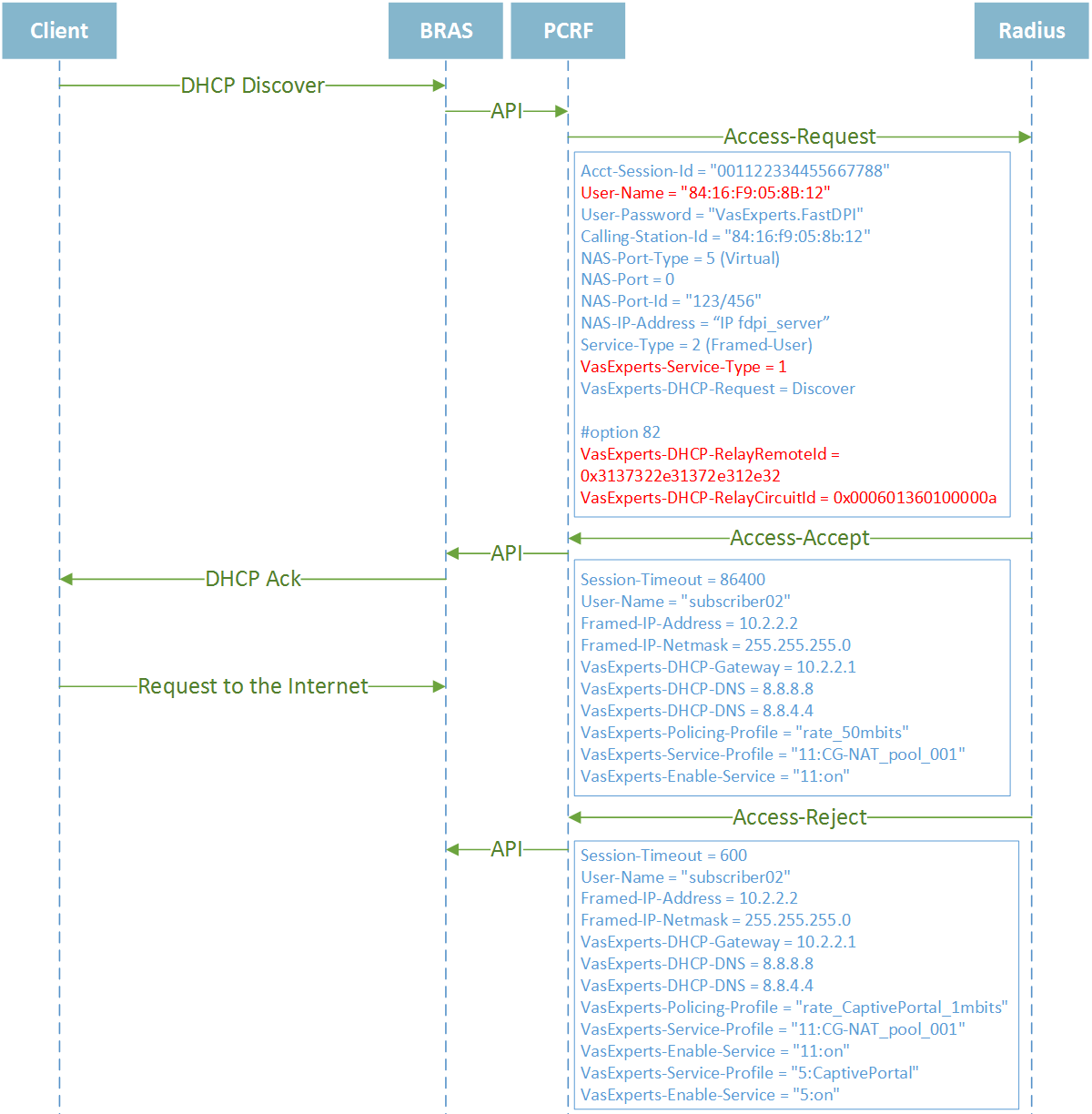 По DHCP запросу - В этом случае, когда BRAS фиксирует DHCP запросы со стороны абонентской сети, то формирует соответствующие Radius запросы для получения параметров DHCP-аренды которые сообщаются абоненту. Кроме того, в ответе на DHCP-аутентификацию можно, также, передать параметры сессии влияющие на прохождение трафика абонента. При передачи параметра Session-Timeout является значением временем аренды адреса (lease time). При раздельном получении параметров DHCP и трафика (IP) можно указывать различные значения Session-Timeout, что разумеется будет довольно удобно, так например выдать время аренды 6 часов, но при этом проводить реавторизацию параметров трафика каждый час.