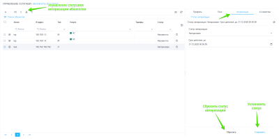 Выделите абонента и в форме редактирования перейдите на вкладку "Авторизация" как показано на рисунке ниже. Так же есть возможность управлять статусом авторизации для нескольких выбранных абонентов или для всех сразу. Для этого необходимо нажать кнопку Управления статусами авторизации абонентов в тулбаре над списком абонентов.