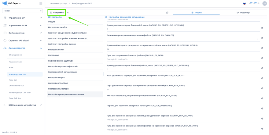 - BACKUP_FS_PATH - путь для сохранения бэкапов файлов. (Путь по умолчанию: /var/dpiui2_backup/fs)