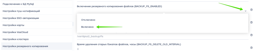 - BACKUP_FS_DELETE_OLD_INTERVAL - время удаления старых бэкапов файлов, в часах. (Значение по умолчанию - 0)