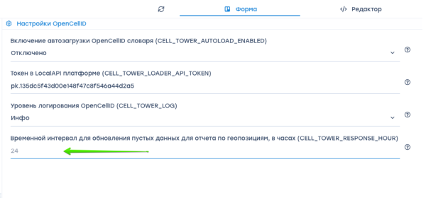 - CELL_TOWER_LOG - укажите временной интервал для обновления пустых данных для отчета по геопозициям, в часах.
