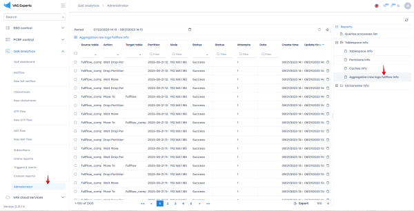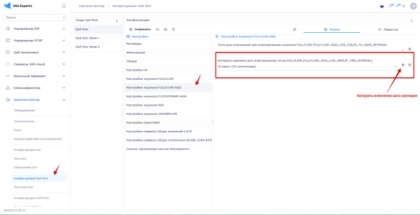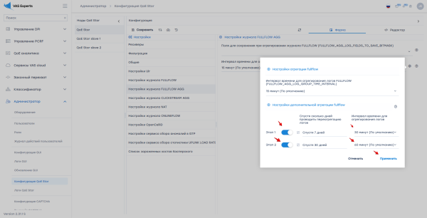 Настройка выполняется в GUI в разделе Администратор \ Конфигурация QoE Stor \ Настройки журнала FULLFLOW AGG