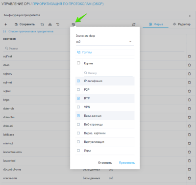Для того, чтобы открыть форму Установки dscp для группы протоколов воспользуйтесь соответствующей кнопкой в тулбаре страницы.