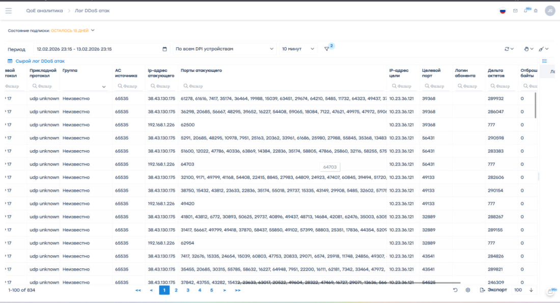 Обнаруженные атаки можно изучить в разделах DDoS атаки в QoE Анлитике.