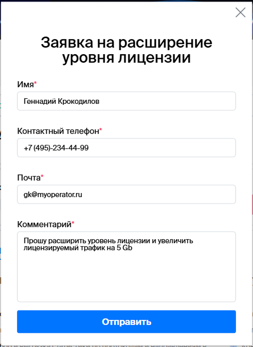 - Для повышения уровня лицензии оставьте запрос в GUI в разделе Сервисы VAS cloud → Личный кабинет → Лицензии. Нажмите на кнопку "+ Запросить лицензию", заполните форму запроса.