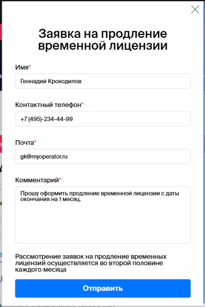 Чтобы отправить заявку на продление временной лицензии, нажмите “Продлить” и заполните форму заявки.