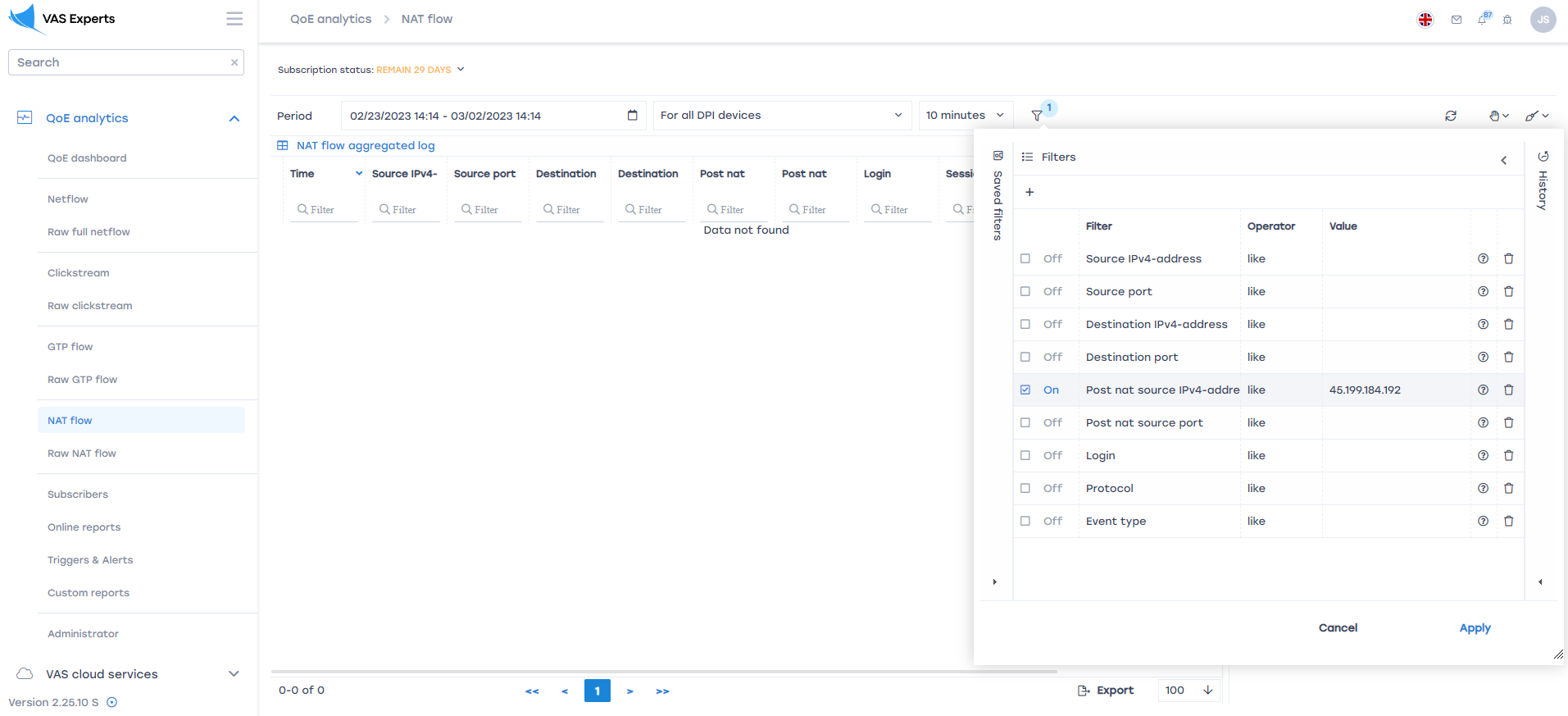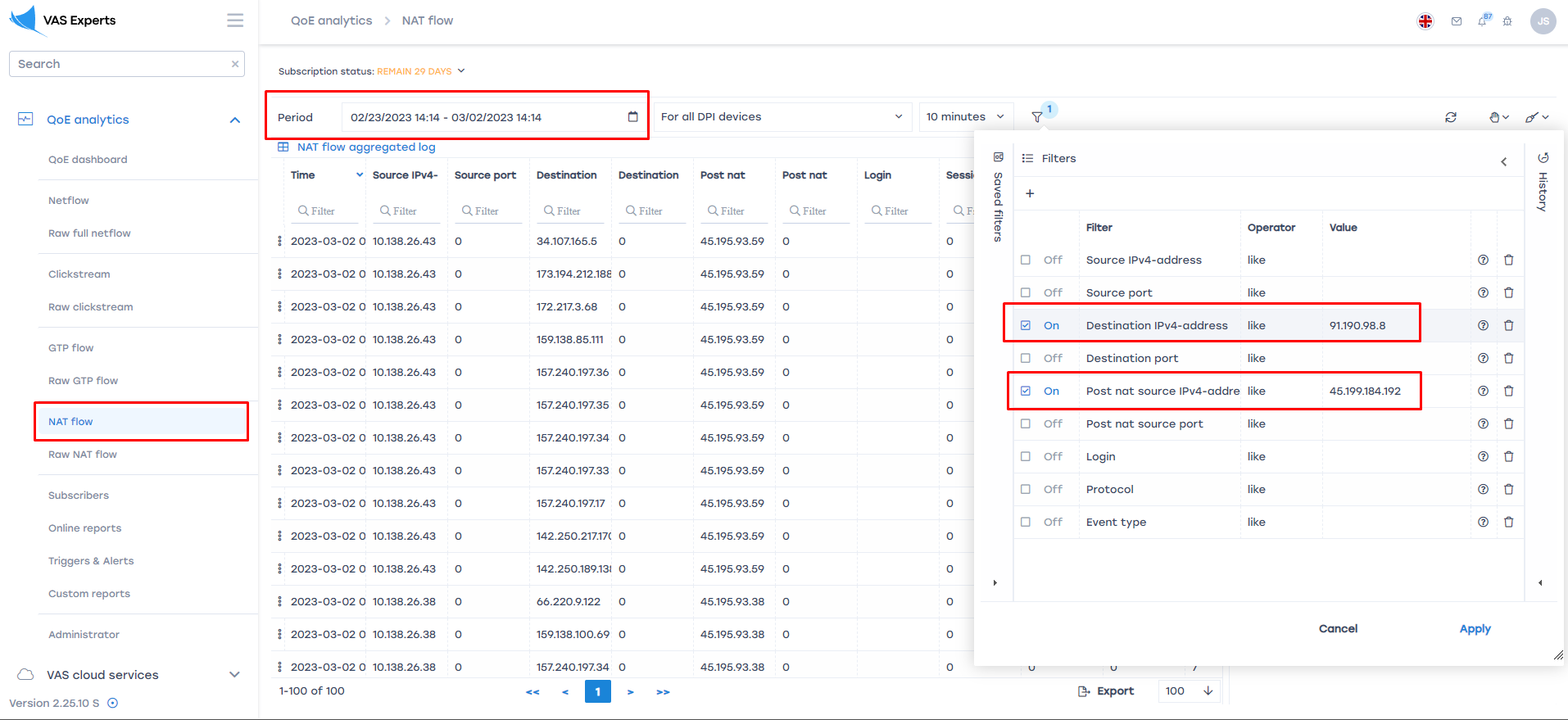 Далее в GUI СКАТ необходимо открыть раздел NAT flow, выбрать период, завести source и destination IP.