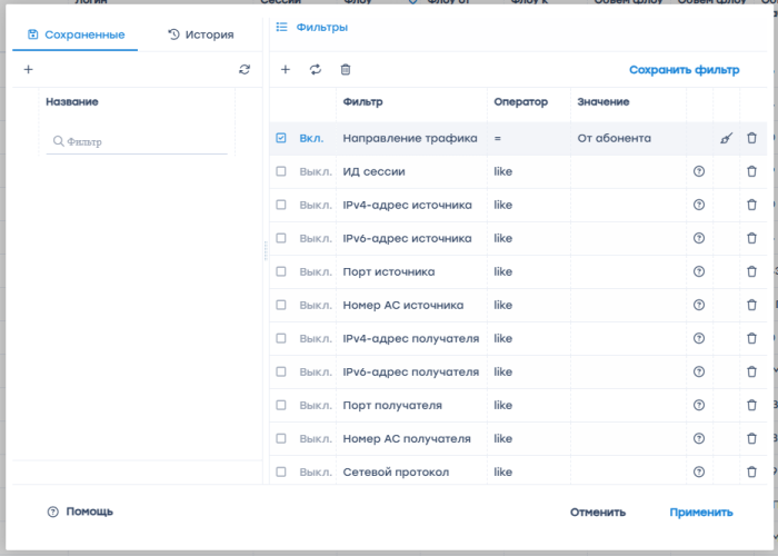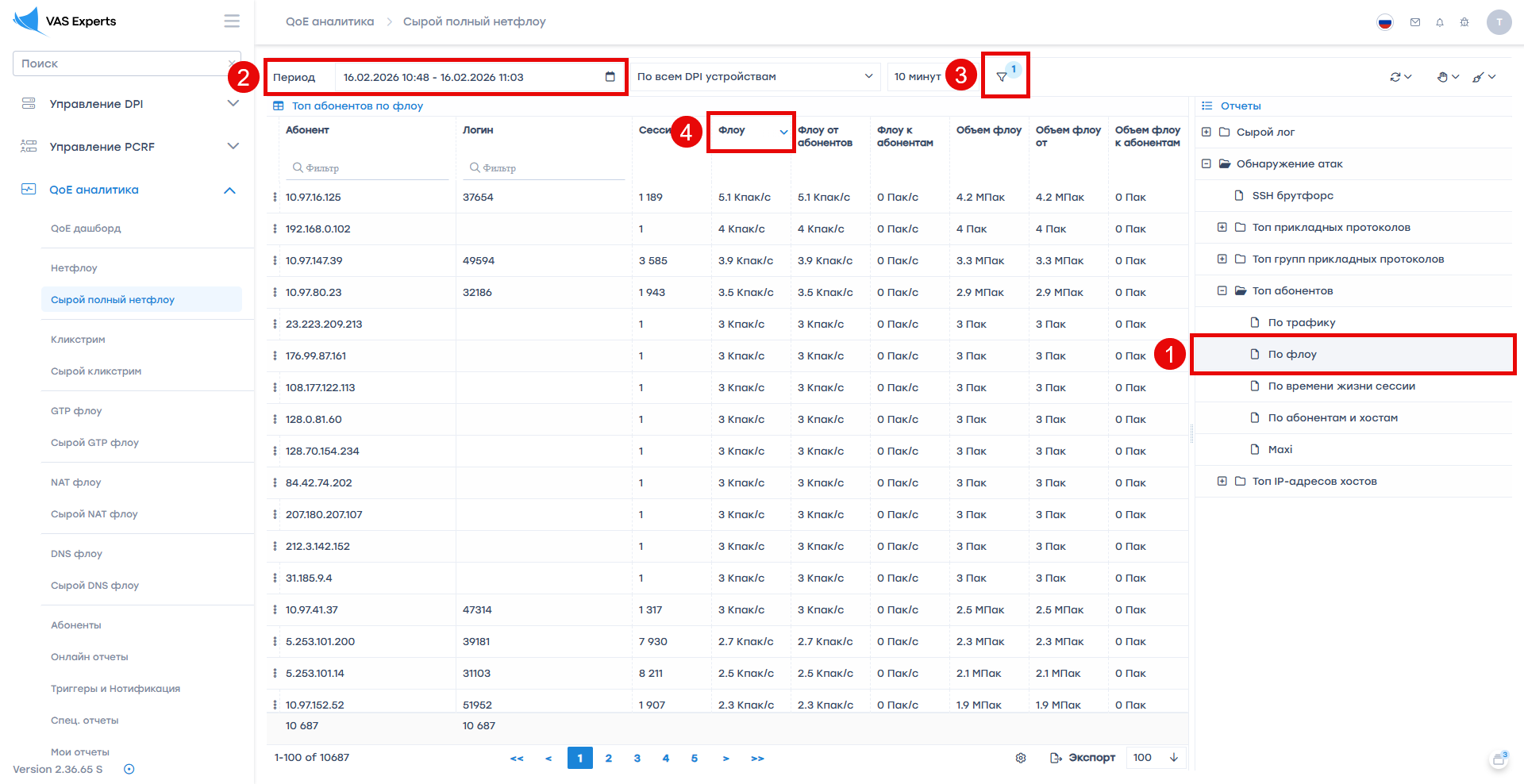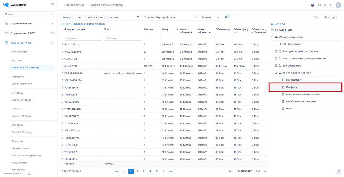 netflow=12– сбор и экспорт статистики: 8 + 4 = fullnetflow + billnetflow (accounting).netflow_dev=vlan200– гдеvlan200– название интерфейса, с которого будет отправляться статистика.netflow_timeout=10– период отправки в секундах.netflow_rate_limit=900' – ограничение потока IPFIX.netflow_full_collector=10.0.0.0:1500– адрес коллектора со статистикой – указать корректный IP QoE.netflow_passive_timeout=5– время ожидания активности в сессии после которого, если не было активности, сессия считается завершенной и происходит передача по ней информации.netflow_active_timeout=20– время, через которое сообщается информация по длинным сессиям (т.е. фактически длинные сессии разбиваются на фрагменты данной продолжительности).netflow_full_collector_type=2– экспорт IPFIX на TCP коллектор.ipfix_reserved=1– позволяет зарезервировать необходимую память для возможности включения/изменения параметров IPFIX/Netflow.