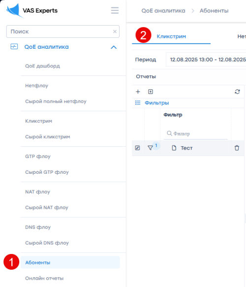 - Перейти в раздел QoE Аналитика → Абоненты → Кликстрим