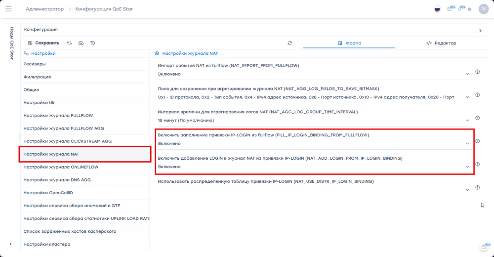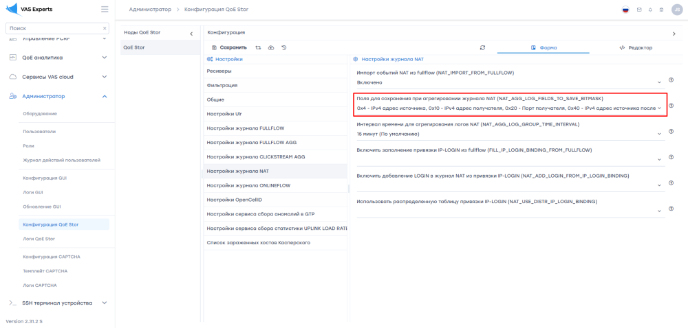 - Перейти в раздел формы "Настройки журнала NAT";