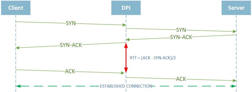 Регистрация каждого нового flow на DPI производится не по сообщению SYN от инициатора TCP соединения, а при получении ответа SYN/ACK, поэтому подсчет RTT производится исходя из разницы передачи и приема последующих сообщений: