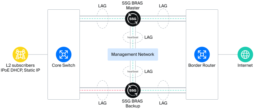 - BRAS L2 redundancy for IPoE (DHCP and Static IP) is recommended using the Active-Standby scheme, which involves connecting two SSG BRAS devices to a single broadcast L2 domain: one in Master mode, the other in Backup mode (hot standby).