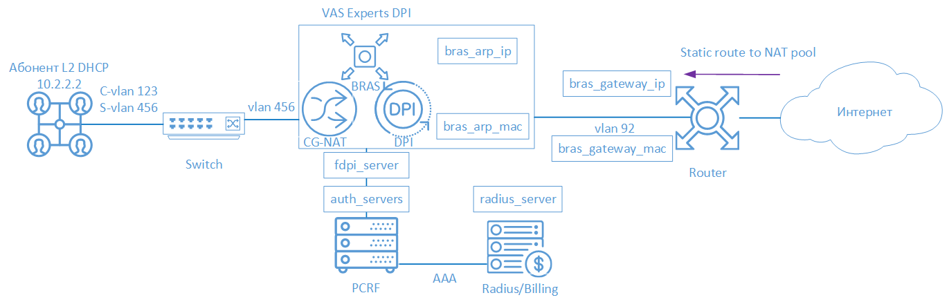 #enable internal database of user properties udr=1 #enable IP authorization mode enable_auth=1 #activates L2 BRAS mode bras_enable=1 #DPI "virtual" IP address (must be unique for the network) bras_arp_ip=192.168.1.2 #"virtual" DPI MAC address (you should use the real MAC address of any of the DNA interfaces) bras_arp_mac=a0:36:9f:77:26:58 #border IP-address bras_gateway_ip=192.168.1.1 #MAC address of the border’s interface to which DPI is connected bras_gateway_mac=c4:71:54:4b:e7:8a #server data where fastPCRF is installed (if the same server, do not change) auth_servers=127.0.0.1%lo:29002 #enable DHCP Relay Agent mode bras_dhcp_mode=1 #192.168.10.2 – DHCP server IP-address #veth0 – the name of the network interface connected to the DHCP-server #67 – port, default value: 68 #arp_proxy - response lag to ARP requests of the DHCP server IP-address #alias_ip - DHCP server alias #reply_port - the port that expects responses from the DHCP-server. bras_dhcp_server=192.168.10.2%veth0:67;arp_proxy=1;alias_ip=192.168.1.4;reply_port=67 #vlan termination (this value means tag will be removed) bras_vlan_terminate=1 #MAC-addresses replacement bras_terminate_l2=1 #local traffic interconnection bras_terminate_local=1 #enable accounting enable_acct=1 #subscriber billing statistics netflow=4 #timeout for sending statistics netflow_timeout=60