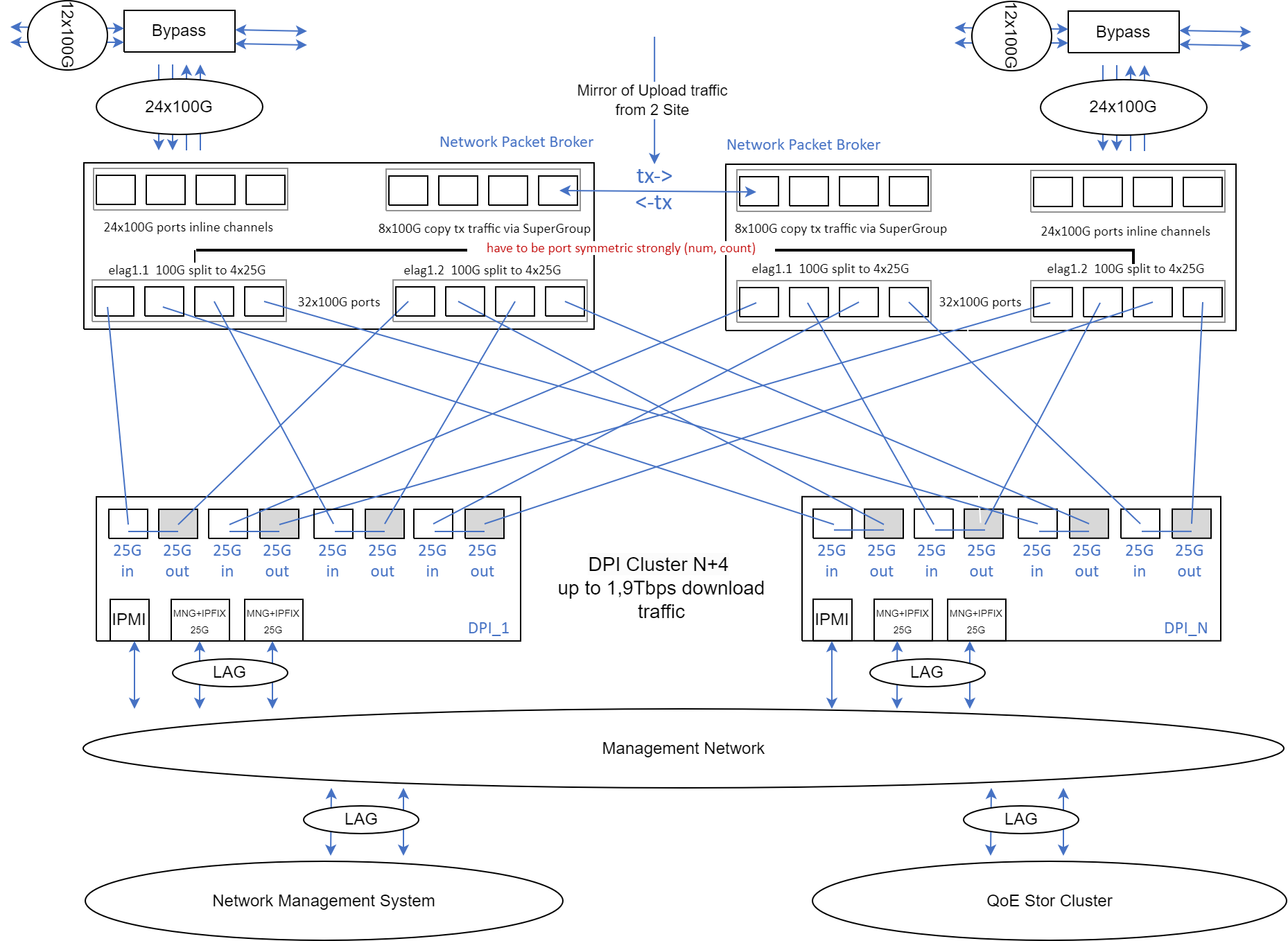The operator's links are connected "in-line" to the traffic balancing devices through an optical bypass, ensuring network protection in case of hardware component failure or software malfunction. The traffic balancer distributes flows among the nodes, ensuring symmetric session-aware load balancing (L3/L4). The entire complex functions as a transparent L2 device and generally does not require additional configuration from the operator or changes to the network's logical topology. If there is asymmetric traffic (outgoing traffic passes through one site/DPI cluster, and incoming traffic passes through another site), it is necessary to send a copy of only OUTGOING traffic from one site to another. Thus, ALL outgoing traffic gets into DPI clusters at different sites and traffic asymmetry is eliminated. Note that outgoing traffic is 10% of incoming traffic, so mirroring between sites does not require wide channels, and the load on the DPI cluster does not increase.