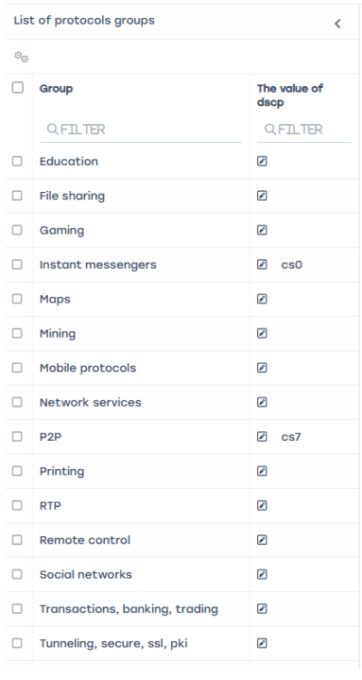 - Assign classes to protocol groups in the column "The value of DSCP". Classes range from cs0 (highest priority) to cs7 (lowest), with "drop" blocking the protocol. Assign high priority (cs0) to VoIP applications, Video, and messenger groups, and low priority (cs7) to the P2P group.