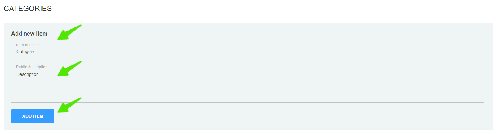To edit: click on the category editing button in the categories table. In the form, change the name and/or description of the category, then click the "Save" button.