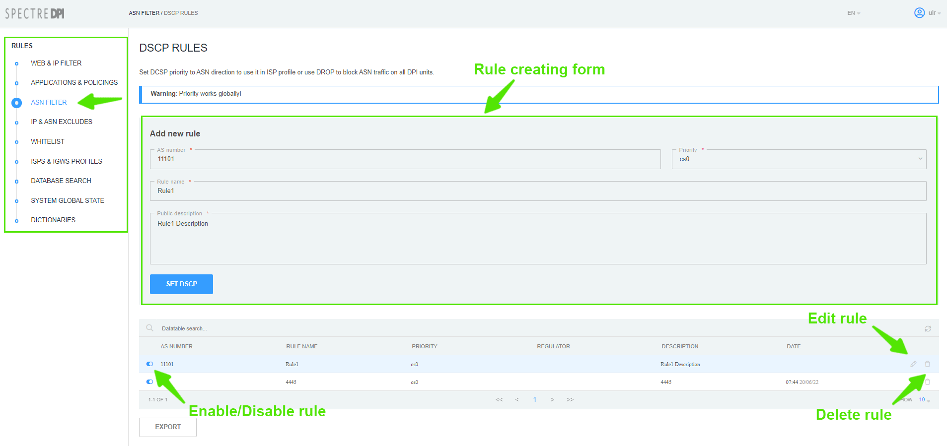 In the list of DSCP in ASN direction rules click the button “Delete rule” and confirm/cancel the operation.