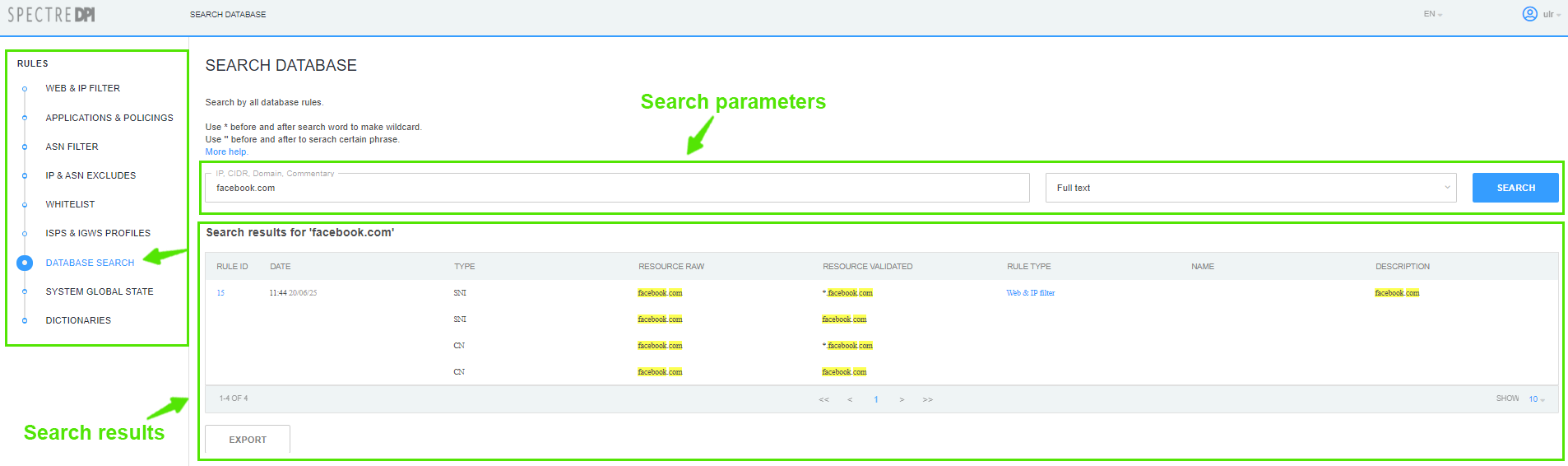6 Filtering rules management interface