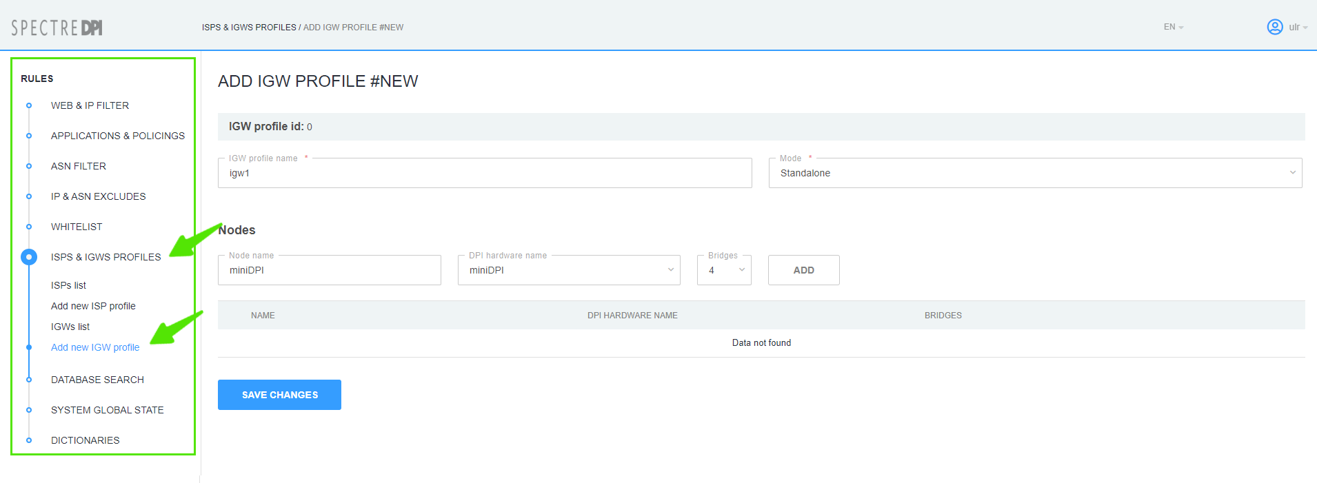 To create new IGW profile change to the section "ISPS & IGWS Profiles"→"Add new IGW profile".