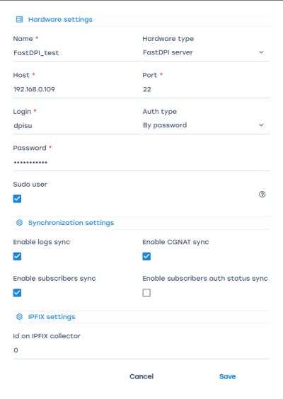 If you selected "FastDPI server" as the equipment type, an extended form will open