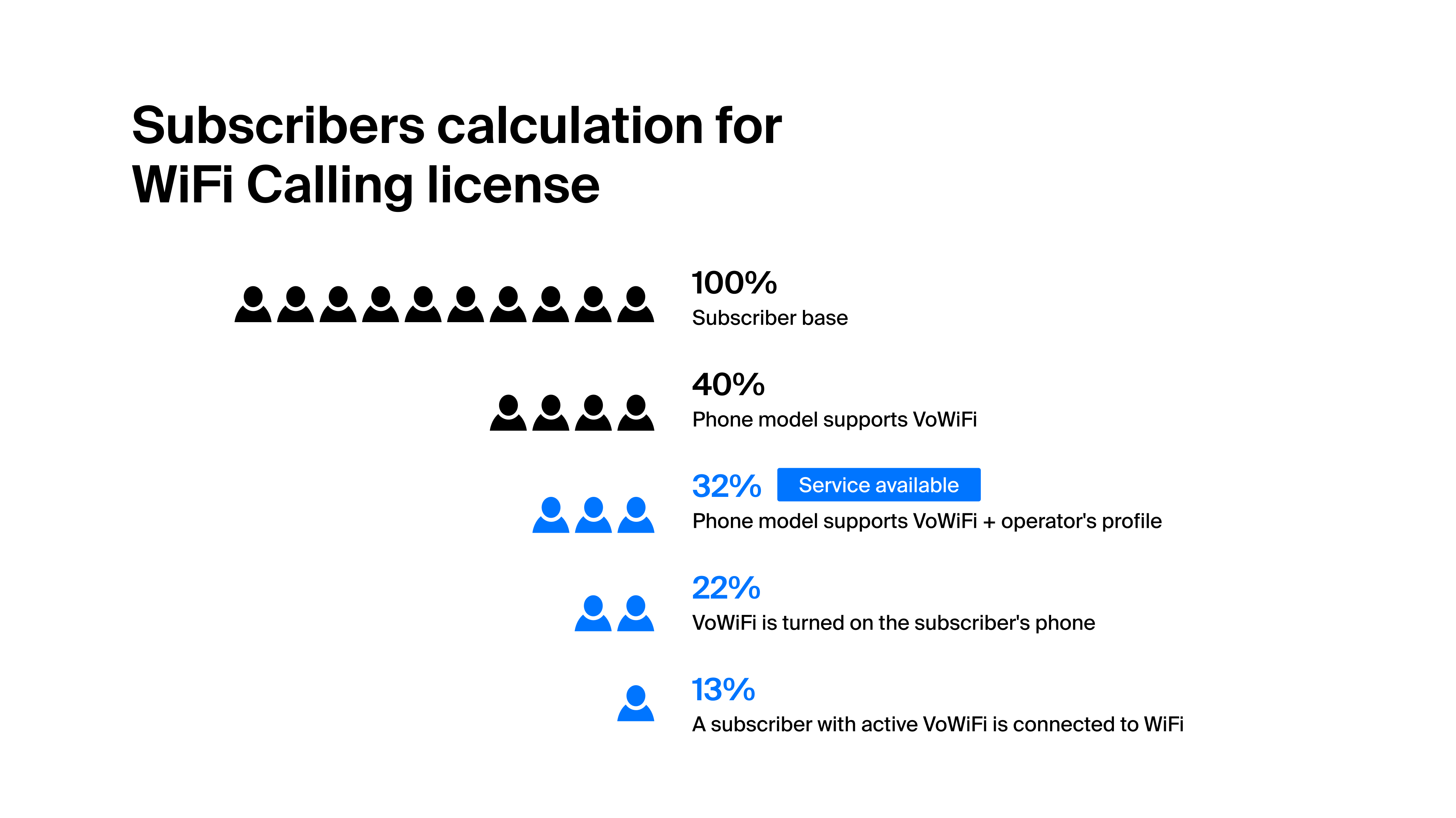The process of loading the operator's profile on different phone models from various vendors takes time and happens gradually. Therefore, to launch WiFi Calling, it is possible to purchase a "starter package" for a small number of subscribers (up to 5% of the subscriber base) and then, as the service penetration increases, to increase the license package to the recommended 13% of the subscriber base.