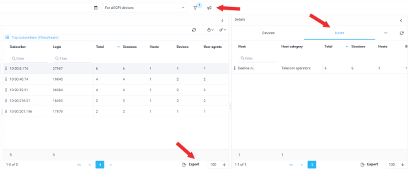 DPI exports ClickStream — all HTTP/HTTPS user requests on the Internet. The QoE module aggregates information per IP (or login, if used). The statistics include URLs for HTTP and domain names for HTTPS.