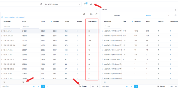 DPI exports unique UserAgents sent in HTTP requests. The QoE module aggregates information for each IP (or login, if used). The statistics record every phone and PC behind subscriber NAT. Usually, up to 30 unique UserAgents are detected per household — any number higher may indicate reselling the Internet connection to other apartments via the main router.