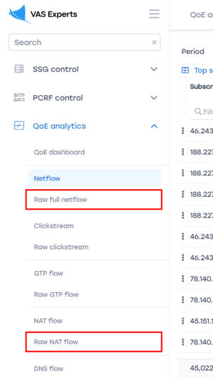 Subscriber activity data becomes available after NAT log creation — see NAT Flow configuration. In the GUI, go to QoE Analytics → NAT Flow. Then: