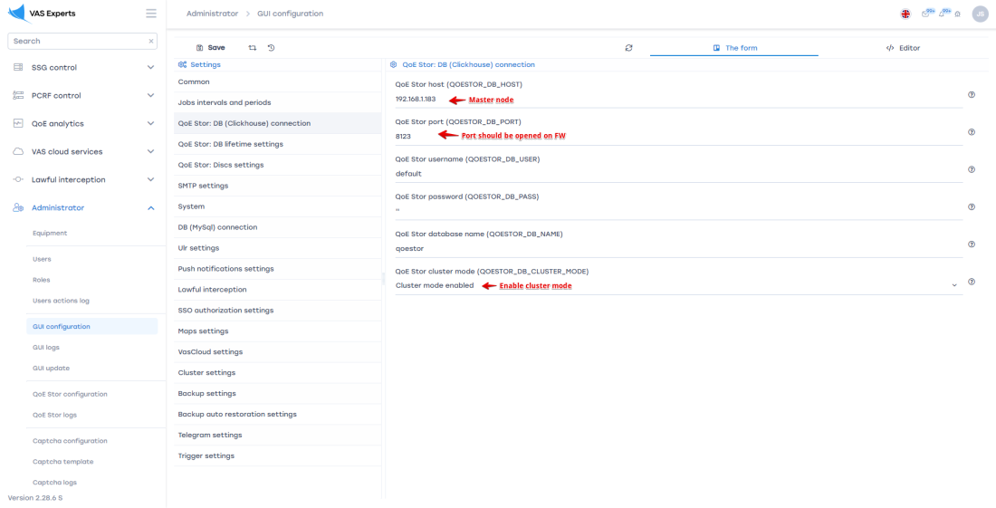 To create a QoE Stor cluster, configure the cluster node settings on each node in the file /etc/clickhouse-server/config.d/qoestor-cluster-config.xml.