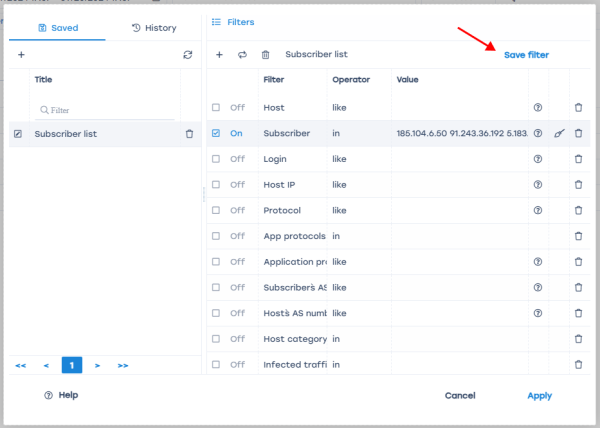 1. Click on “+” in the left part of the filter settings window, under the “Saved” tab, to create a new profile and give it a name: